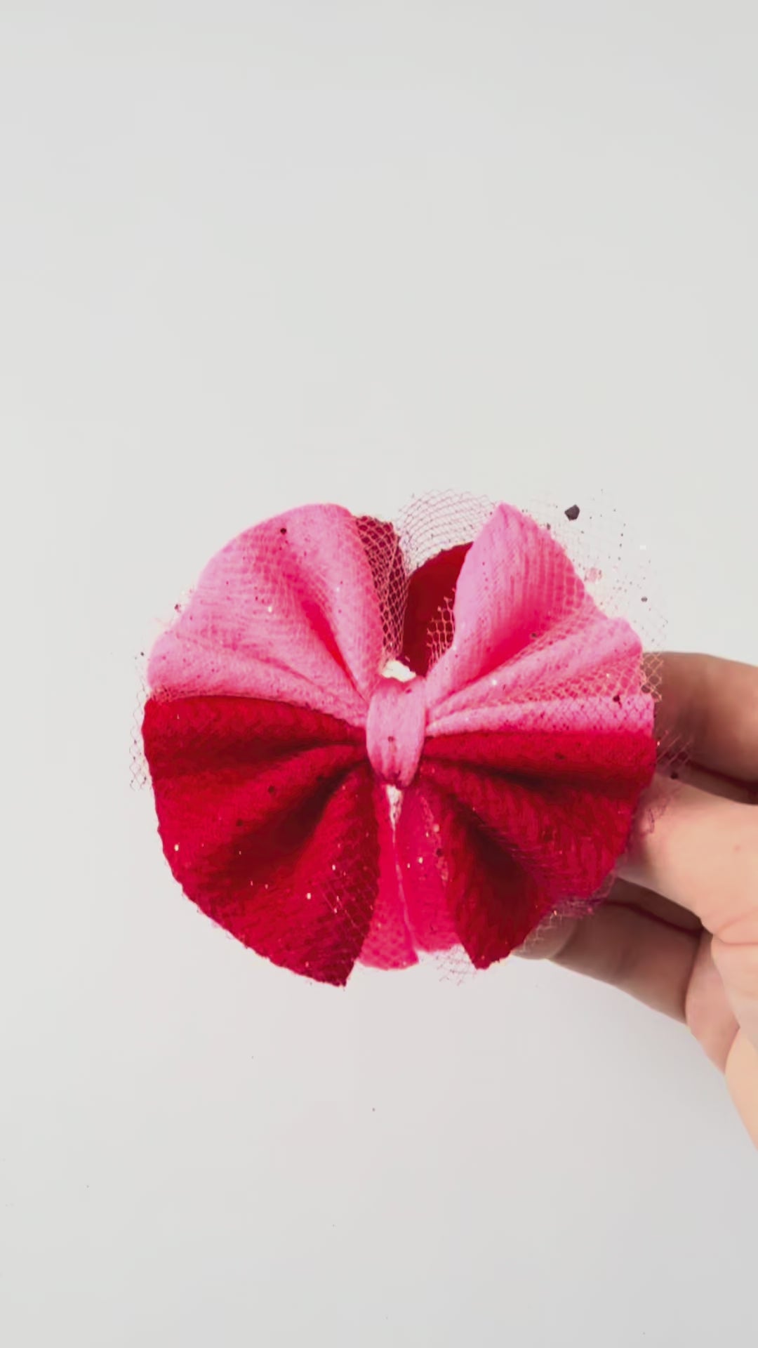 A super soft and super cute shredded bow featuring hot pink and red bullet fabric and coordinating hot pink and red sparkle tulle overlays. The perfect addition for Valentine's Day festivities!