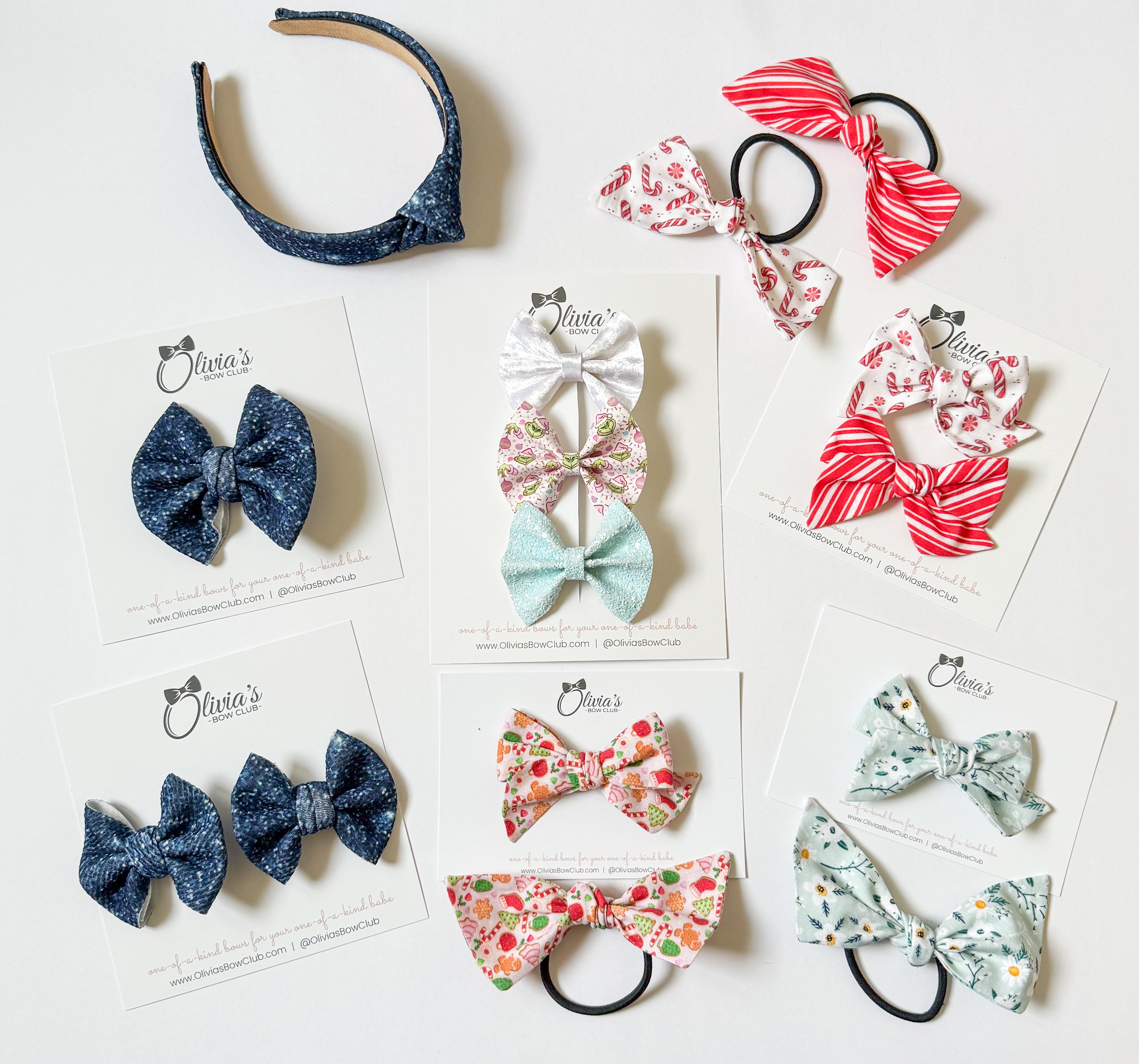 Available in our 3" Olivia bow style on clip or skinnies (skinny nylon headbands).
